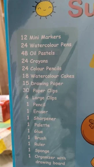12 mini markers, 24 watercolor pens, 48 oil pastels, 24 crayons, 24 colored pencils